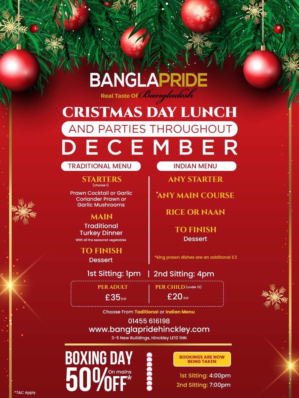 Book a TableBangla Pride, the Best Indian restaurant in Hinckley has been recognised for its special touch of Indian & Bangladeshi dishes. We assure you that you will always get to experience fine dining in a cosy atmosphere with your beloved ones. Every single time you visit us accompanying family & friends, the symphony of flavours, colours and taste along with luxurious decorum will be in your mind forever.
